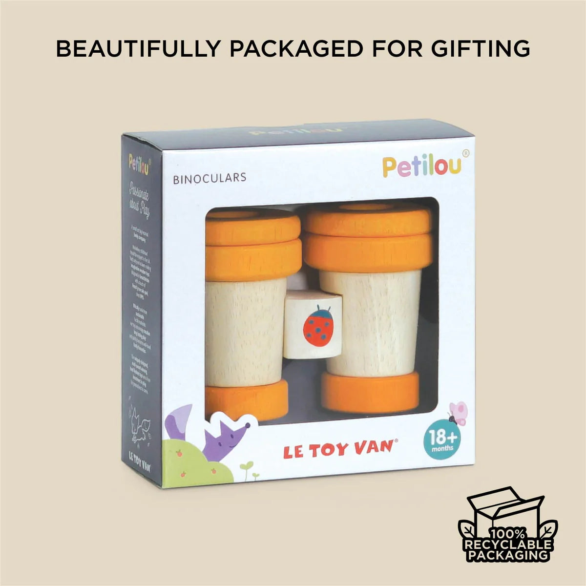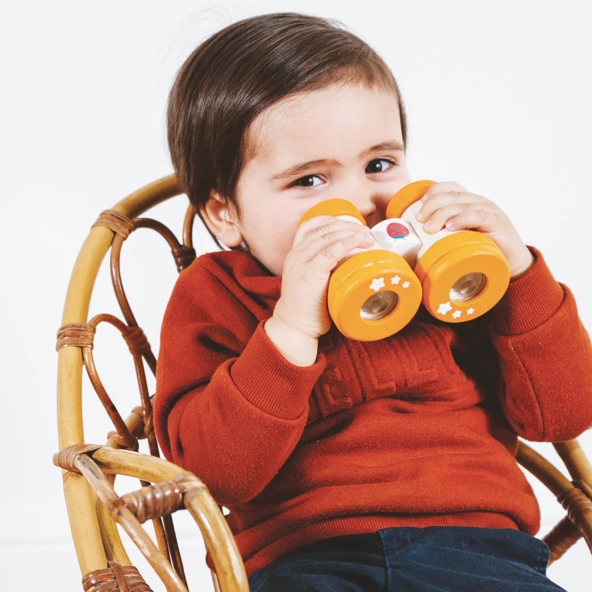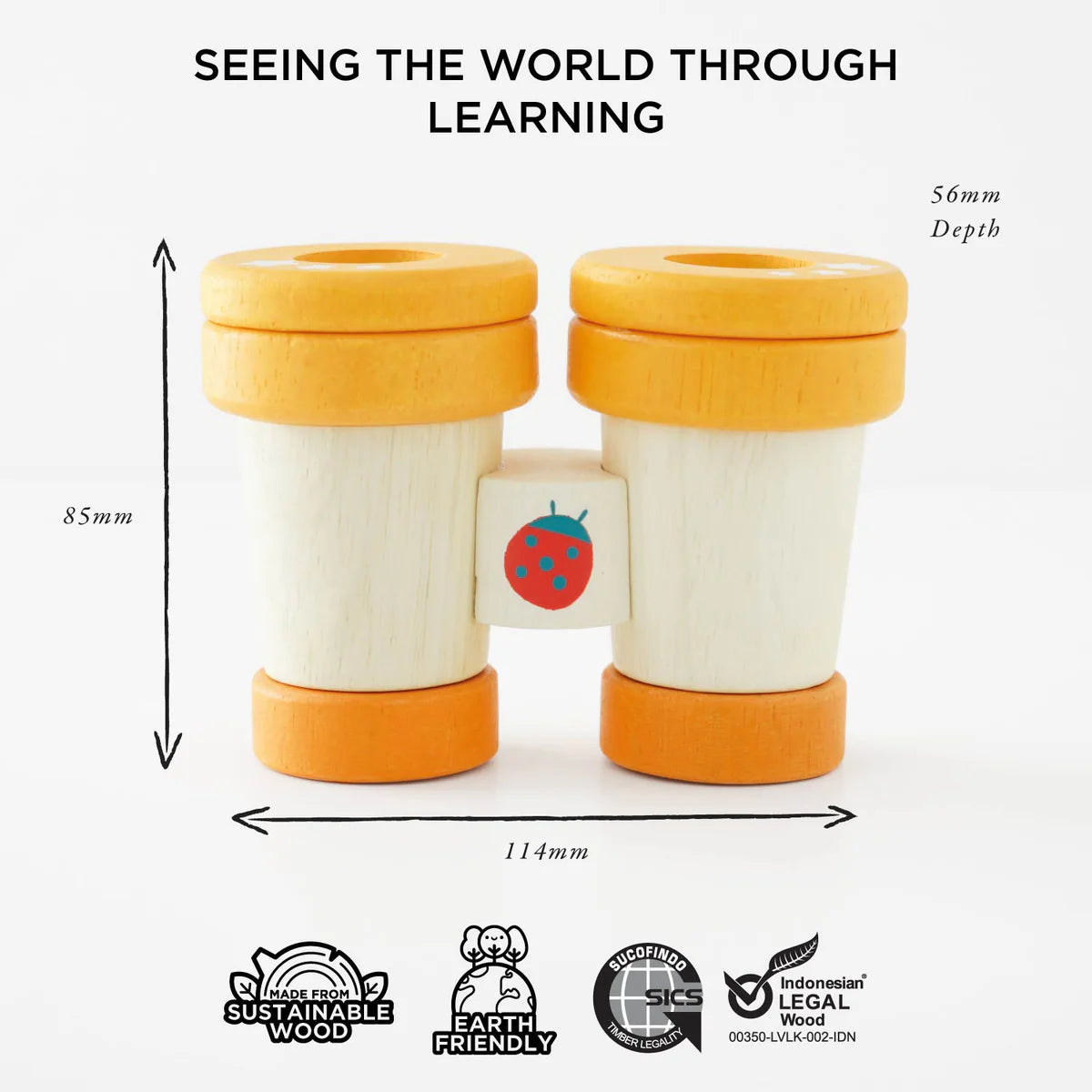 Made from solid natural wood, these children’s pretend play binoculars feature two spinning kaleidoscopic lenses for multi sensory learning based fun.