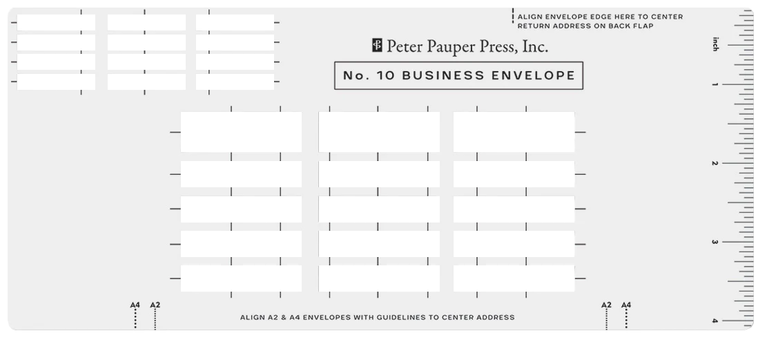 Includes 4 templates designed to fit the most common envelope sizes: one A7 invitation and greeting card envelope template ruled for print writing; one A7 envelope template ruled for calligraphy; one A1 response card and thank you note envelope template; one number 10 business envelope template, with guidelines for A4 and A2 envelopes.